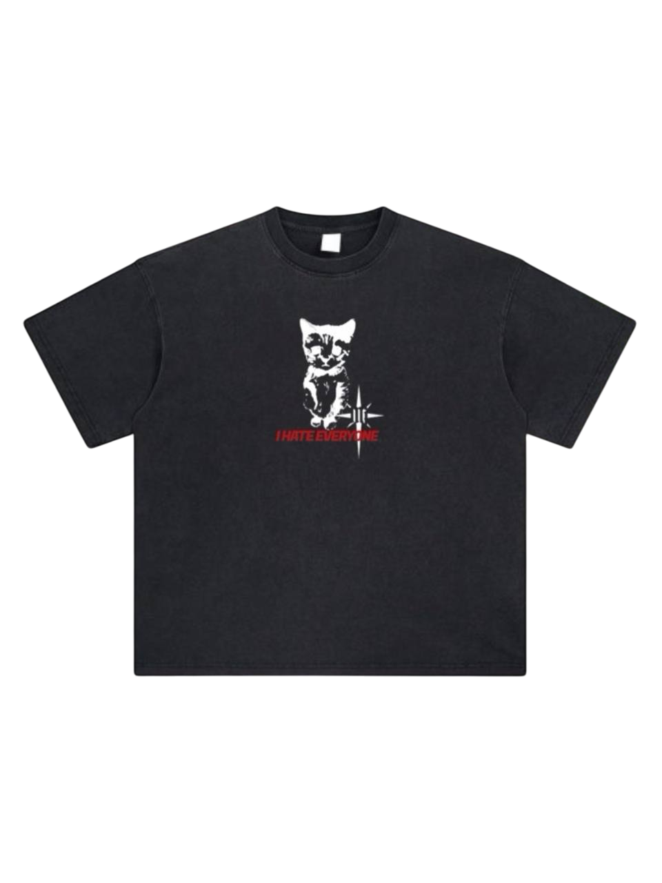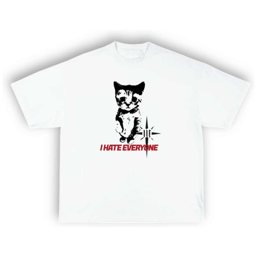 Белая oversize футболка премиального качества с ироничным принтом в стиле streetwear и archive fashion. На груди — контрастное изображение кота в чёрно-белом исполнении с надписью "I HATE EVERYONE" в красном цвете и минималистичным графическим элементом.