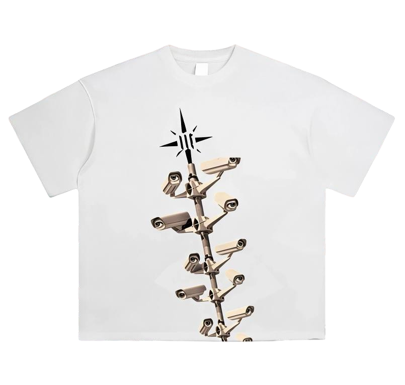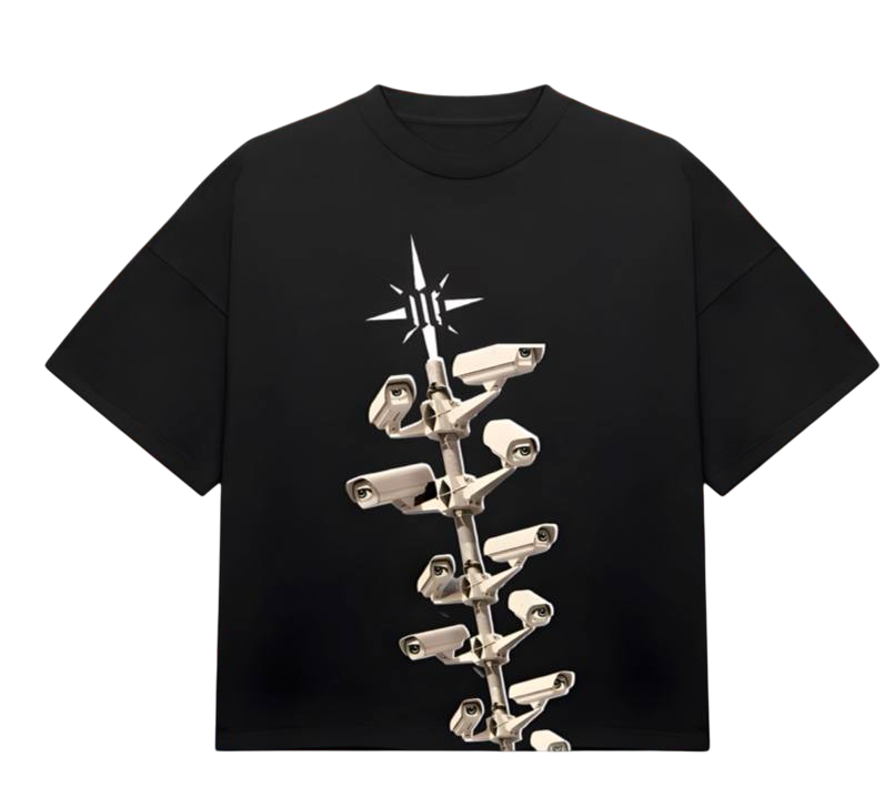 Черная и белая oversize футболка в уличном стиле с дерзким графическим дизайном. На груди расположен контрастный принт, выполненный по технологии DTF, с изображением столба с камерами, дополненный декоративными графическими элементами в виде звезд.